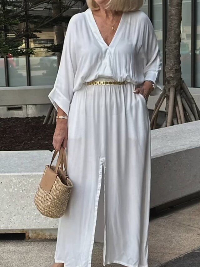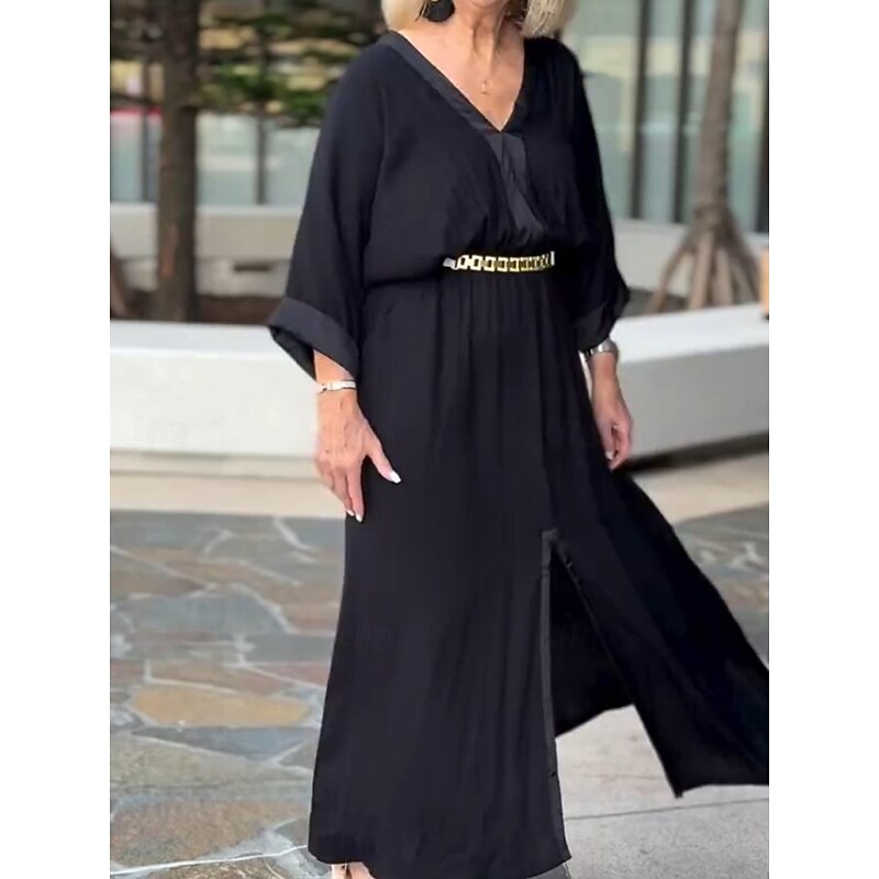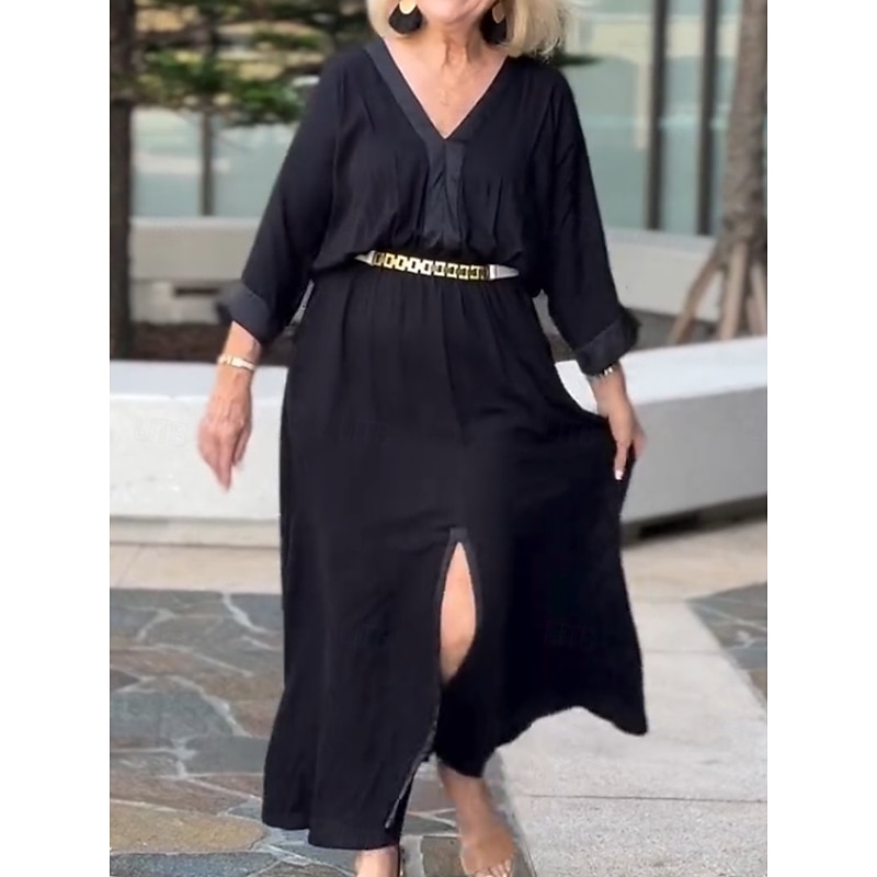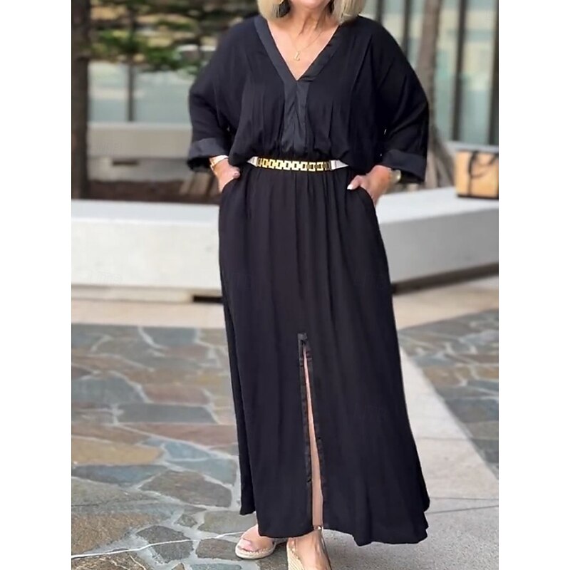 Women's Maxi Dress Linen-Inspired Dresses Casual Dress Basic Casual Vacation Daily Regular Fit Plain 3/4 Length Sleeve V Neck Black White Summer Spring