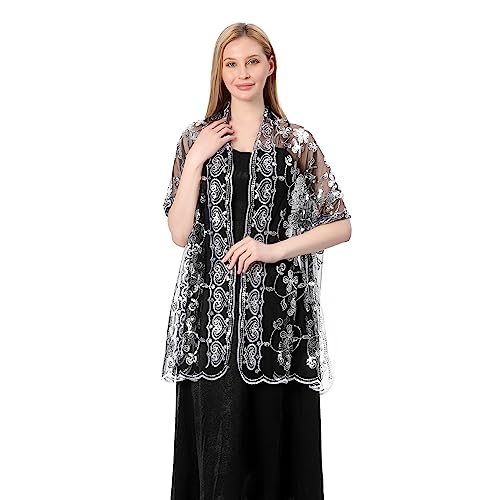 Sparkly Shawls and Wraps for Evening Dresses, Women's 1920s Sequin Floral Sheer Mesh Deco Wedding Party