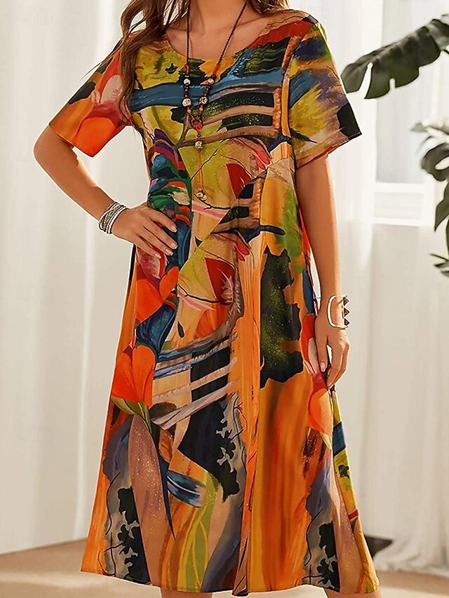 Highlights [Fabric] : Crafted from high-quality polyester, this dress is lightweight and breathable, ensuring you stay comfortable even on the warmest summer days. The fabric's soft texture enhances wearing comfort and durability. [Silhouette] : Featuring a flowing A-line silhouette, this dress offers a relaxed fit that flatters all body types. Its midi length adds a touch of timeless elegance, making it versatile for various occasions. [Design Highlights] : The dress boasts an artistic abstract print that distinctly stands out, combined with a classic crew neck and short sleeves for a balance of modern flair and casual charm. [Occasions] : Perfect for daily wear during the summer, this dress is suitable for various occasions, from casual outings to semi-formal events. Its vibrant print and comfortable fit make it ideal for making a sleek statement. [Size Range] : Available in a wide range of sizes from S to 2XL, this dress caters to different body shapes, allowing for a perfect fit that complements each individual wearer. Perfect for everyday use. superior materials and excellent craftsmanship ensure long-lasting durability.