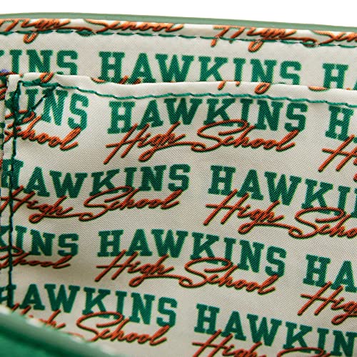 • The Loungefly Stranger Things Hawkins High Crossbody is made of vegan leather (polyurethane). Bag has adjustable shoulder strap (detachable), sturdy metal hardware, appliques, patches, debossed details, and printed details. Take note of the coordinating pattern of the inside lining fabric. This bag is an officially licensed Netflix product.