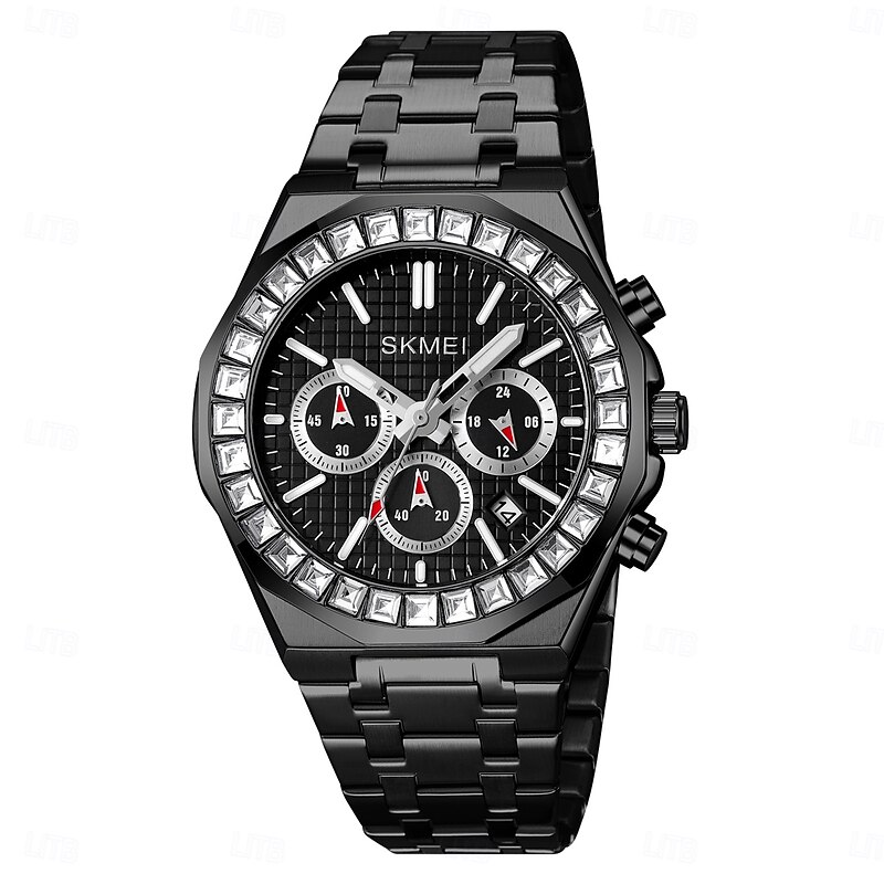 SKMEI Men Quartz Watch Luxury Fashion Rhinestone Business Luminous Calendar Waterproof Decoration Stainless Steel Strap Watch 12