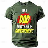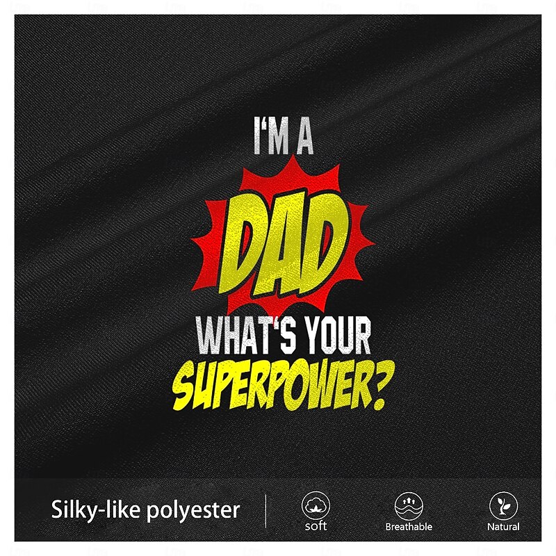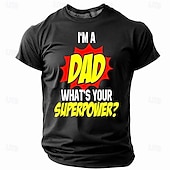 Highlights [Fabric]: Crafted from high-quality polyester fabric, this T-shirt offers a micro-elastic and breathable composition, ensuring comfort throughout the spring and summer seasons. [Fit]: Featuring a regular fit, this T-shirt provides a relaxed silhouette suitable for a variety of body types, allowing for easy movement and all-day comfort. [Design Highlights]: The T-shirt showcases a vibrant 3D print with playful "I'm a Dad, What's Your Superpower?" graphics. The classic crew neck design and bold lettering in red, yellow, and white against a navy background add a touch of humor and personality. [Occasions]: Perfect for sports, outdoor activities, holidays, and casual outings, this T-shirt is an ideal choice for dads who wish to flaunt their super-dad status in a fun and up-to-date manner. [Size Range]: Available in a wide range of sizes from S to XXXL, this T-shirt caters to diverse sizing needs, making it an excellent option for every dad.
