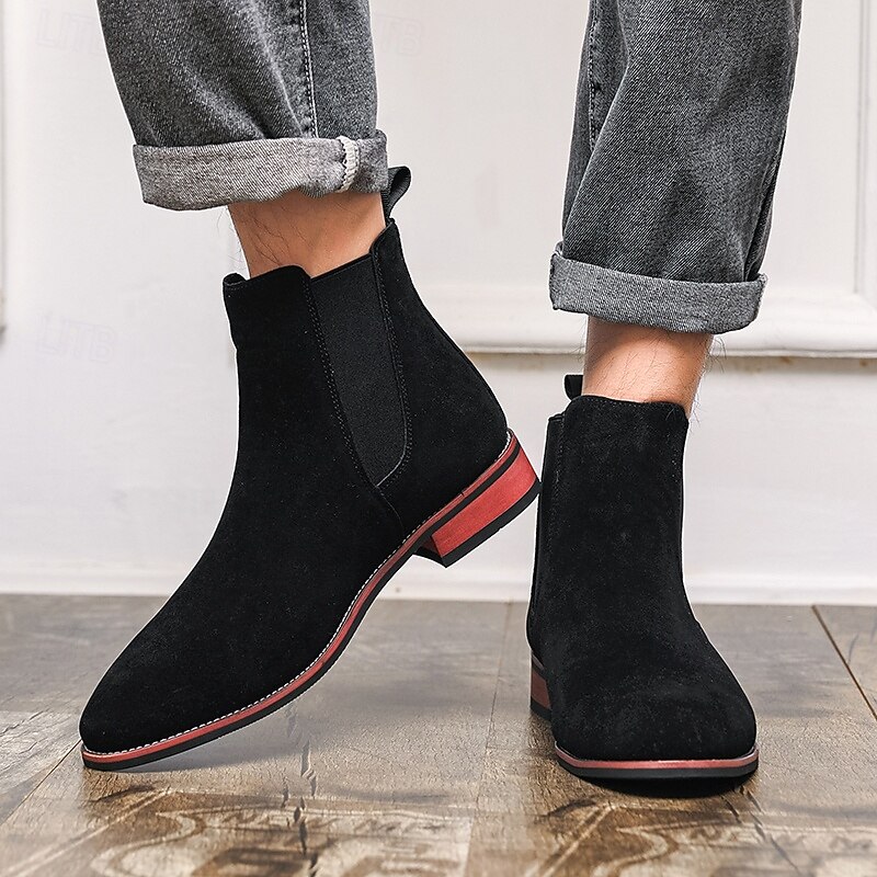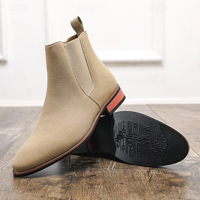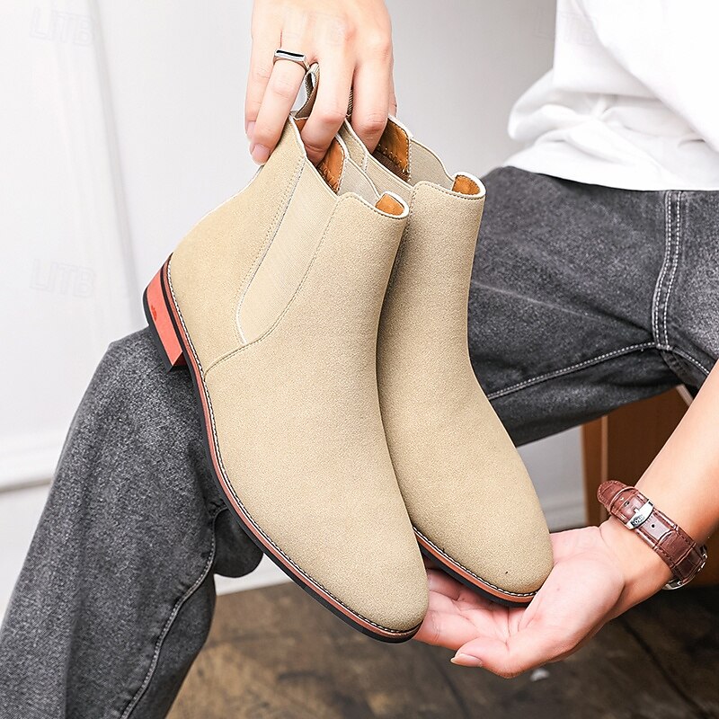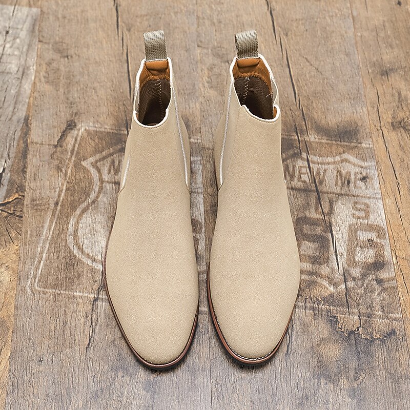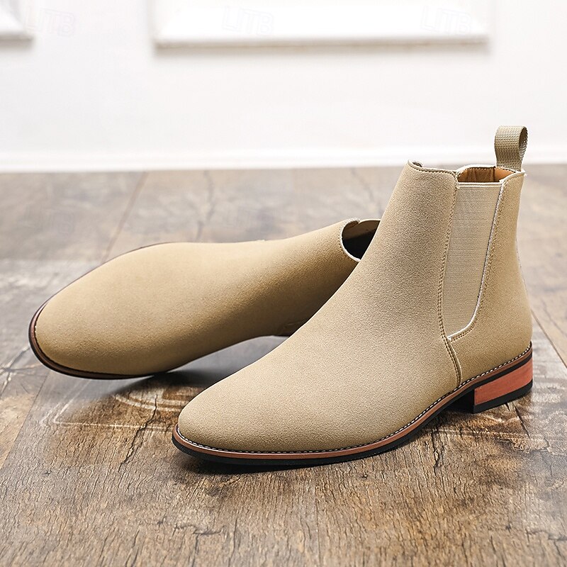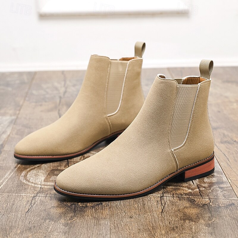 Why Choose Men's Beige Chelsea Boots with Minimalist Design and Slip-On Comfort, present-day Ankle Boot Style for Gentlemen, Suitable for Smart Casual Outfits and Weekend Wear?
